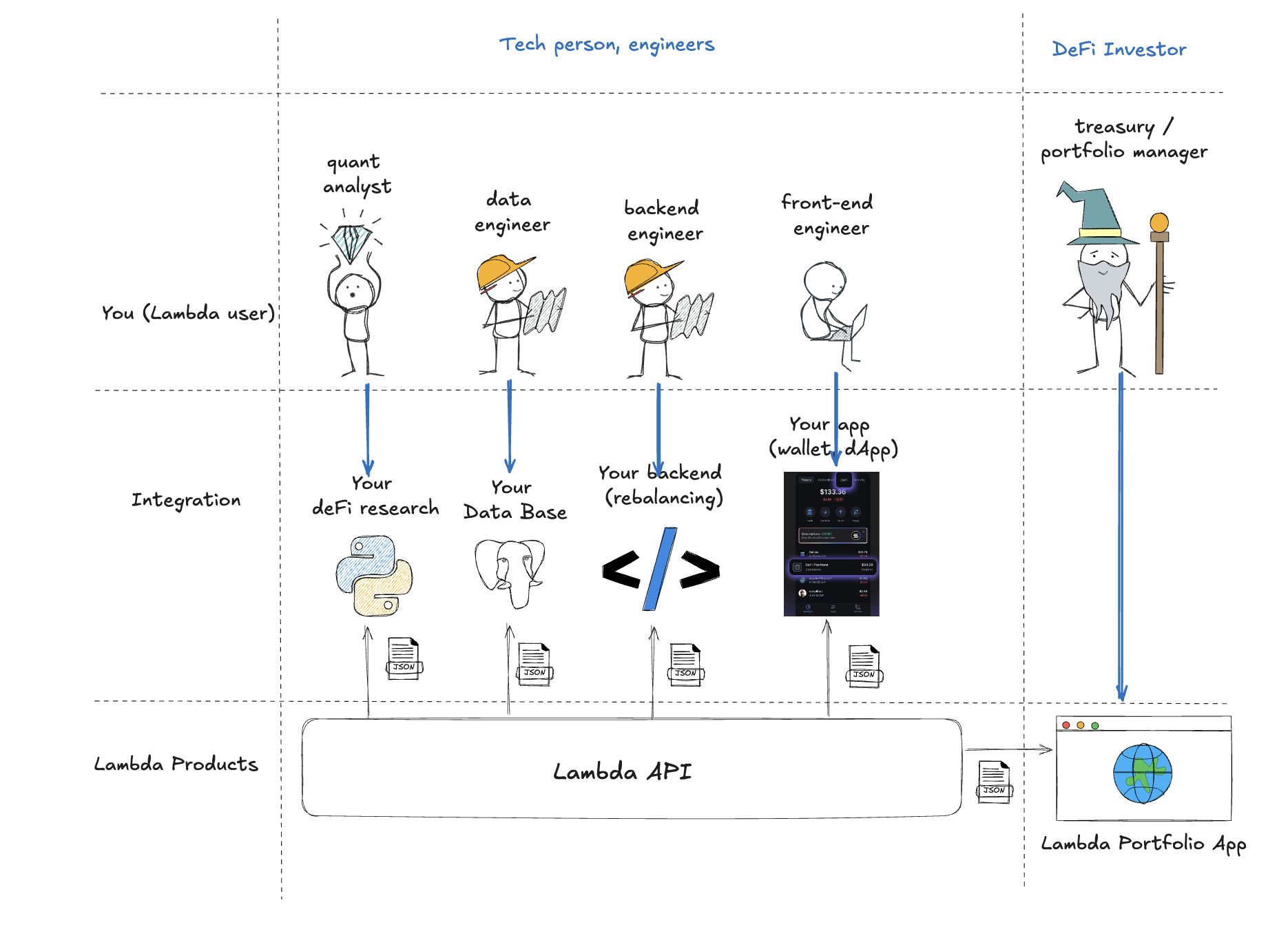 Lambda gives you free will to consume DeFi data your way. There are 2 types of Lambda users: engineers who want to integrate data into their apps and DeFi investors who want insights into their portfolios.
