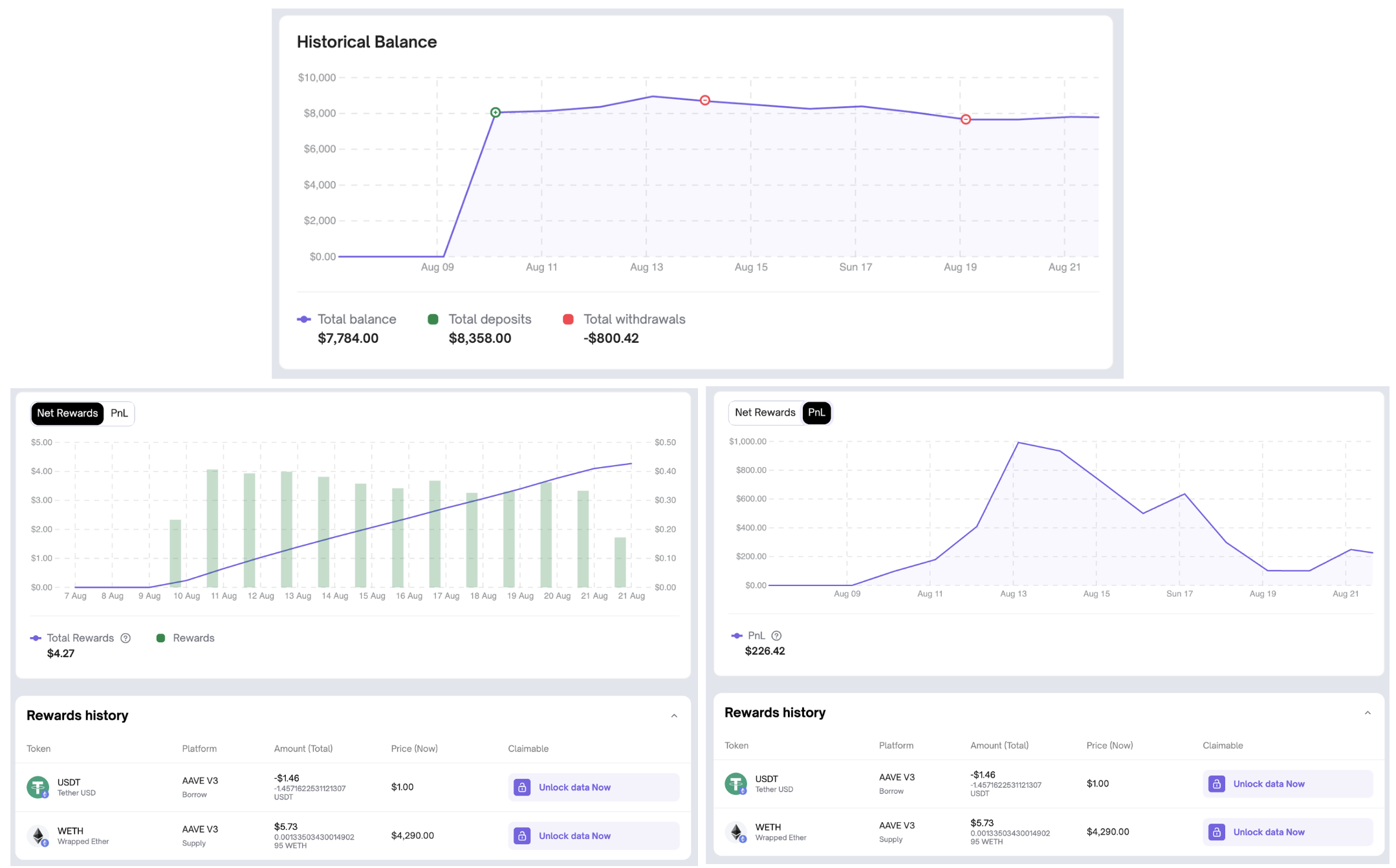 - Portfolio performance analysis. We collect historical DeFi position data separately for balances (own funds) and rewards (generated by the protocol). The unique value is the ability to separate protocol rewards from a user’s own funds in Profit & Loss analysis. We calculate this in token value to distinguish the rewards factor from price changes.